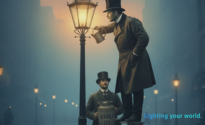But for decades, the public face of the street-light — the small flame in a glass globe — relied on an industrial ecosystem of whaling ships, oil-barrels, lamplighters with ladders, inspectors checking burn-times.